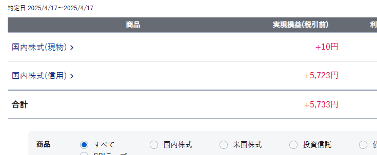 この地合いのなか、信用2銘柄を利益確定できたのはよかった。ETF銘柄は銘柄を間違えて購入してしまったため、すぐに売却した。